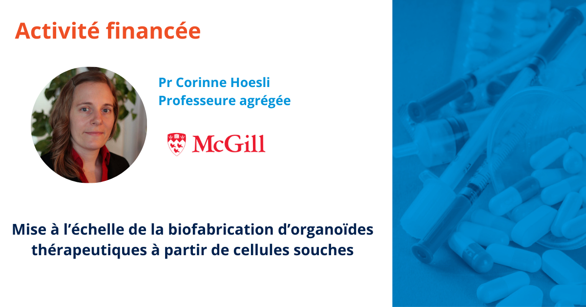 Dans le cadre de sa deuxième phase, Médicament Québec annonce l’octroi d’un financement de 1 100 222$ pour l’activité « Mise à l’échelle de la biofabrication d’organoïdes thérapeutiques à partir de cellules souches » qui sera dirigée par Corinne Hoesli, Professeure agrégée, Université McGill